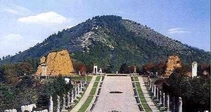 乾陵位于梁山北峰之上,梁山是圆锥形石灰岩山体,共有三峰,南面的两峰较低,泔河环其东,漠水绕其西,形成东西对峙,中间的北峰是最高的。公元684年将李治下葬于此,公元706年,又重启陵门葬武则天,乾陵采用“因山为陵”的建造方式,陵区仿京师长安城建制,为唐高宗李治与武则天的合葬墓。是唐十八陵中主墓保存最完好的一个,也是唐陵中唯一一座没有被盗的陵墓。