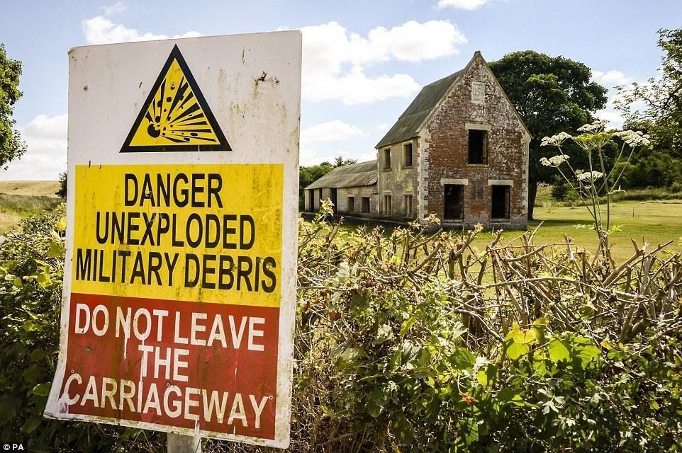 因贝尔小镇一直是英国军事活动频繁地带,最早可以追溯到1897年,一战期间战事紧张的时候,士兵就驻扎在因贝尔当地的法院里。图为遗留下的路边警告牌,提醒民众附近有未爆炸的炸弹残骸。