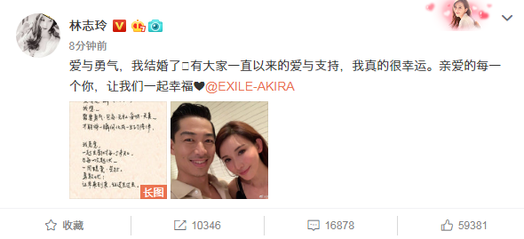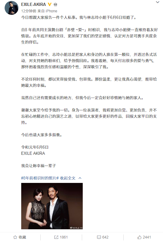 6月6日晚,林志玲突然在微博宣布结婚喜讯,男方是日本男子组合EXILE成员,名叫AKIRA,据悉,两人于8年前共同出演舞台剧时相识,一直维护友好情谊,自2018年底正式交往。