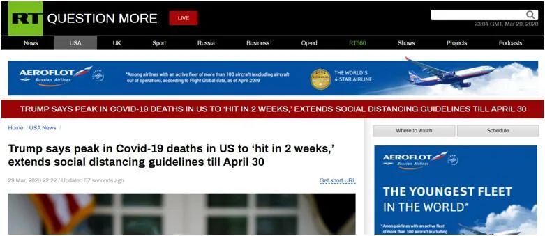 据“今日俄罗斯”(RT)刚刚报道,当地时间3月29日,美国总统特朗普在白宫举行有关新冠肺炎疫情的新闻发布会上表示,美国将对有关新冠肺炎疫情的社交距离防疫建议延长至4月30日。 他还表示,美国新冠肺炎患者的死亡率可能在两周内达到峰值。