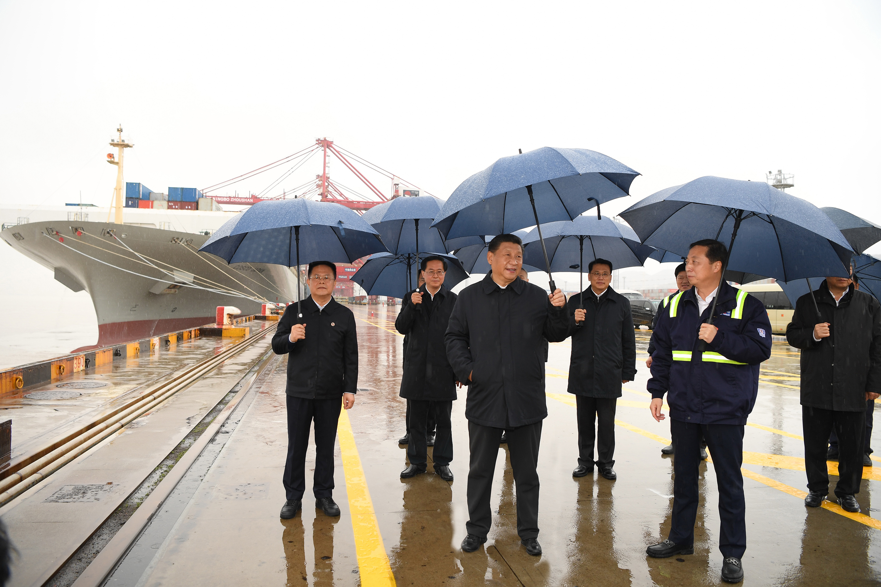 随后,习近平乘车来到穿山港区2号集装箱泊位,冒雨察看了码头现场集装箱作业场景,了解港口作业情况。习近平强调,港口是基础性、枢纽性设施,是经济发展的重要支撑。宁波舟山港在共建“一带一路”、长江经济带发展、长三角一体化发展等国家战略中具有重要地位,是“硬核”力量。要坚持一流标准,把港口建设好、管理好,努力打造世界一流强港,为国家发展作出更大贡献。