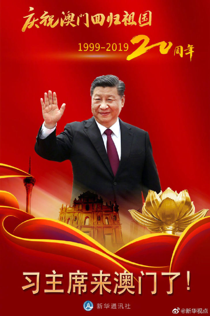 新华社快讯:中共中央总书记、国家主席、中央军委主席习近平18日下午乘专机抵达澳门,出席将于20日举行的庆祝澳门回归祖国20周年大会暨澳门特别行政区第五届政府就职典礼,并视察澳门特别行政区。