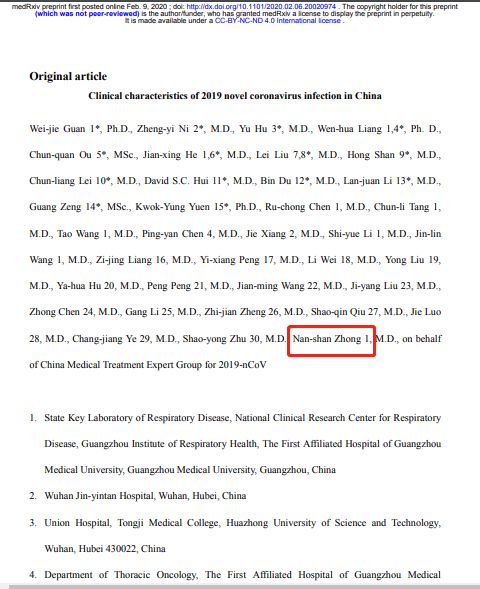2月9日,由国家卫健委高级别专家组组长、中国工程院院士钟南山领衔的“中国2019年新型冠状病毒感染的临床特征”研究,